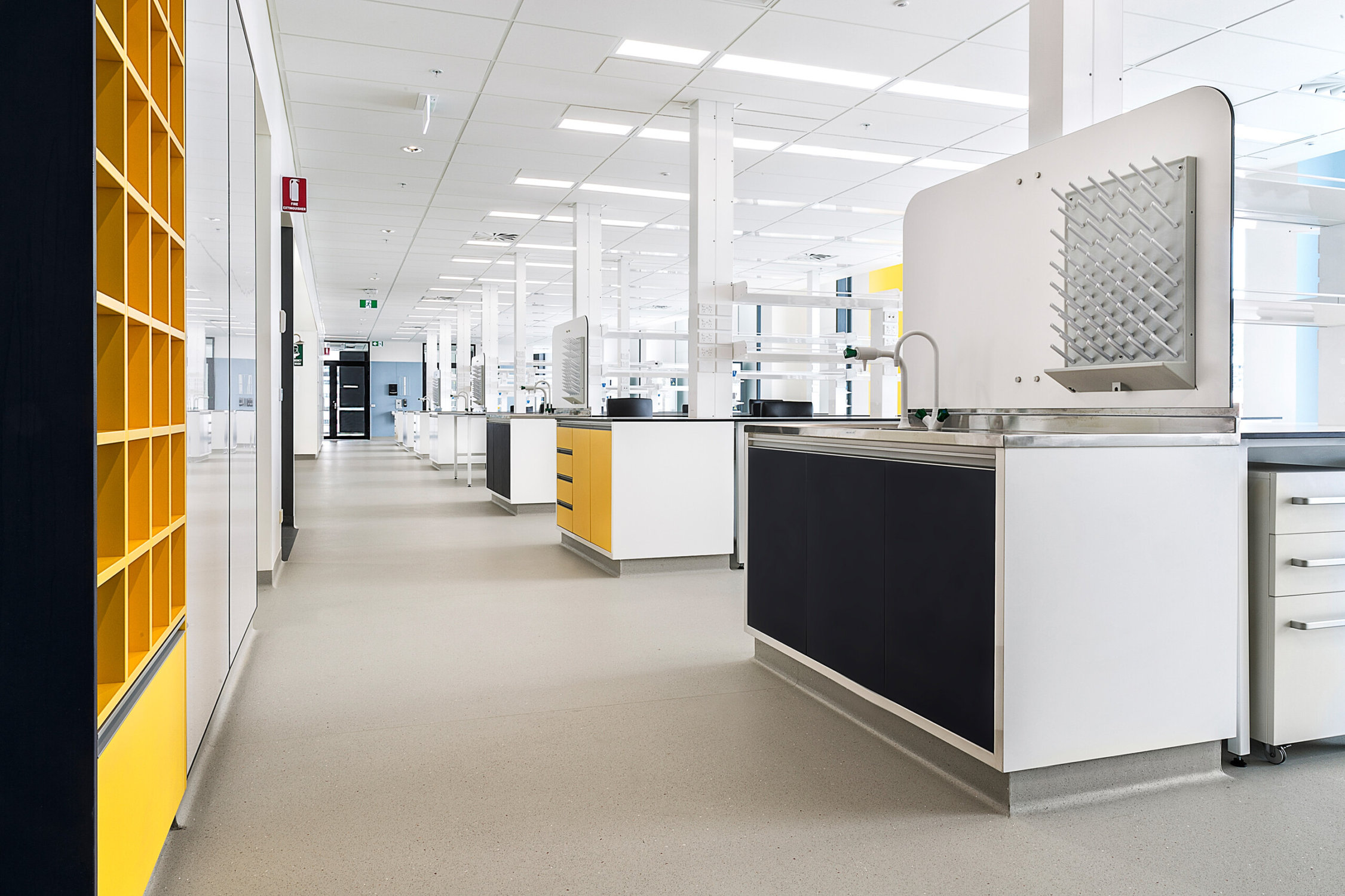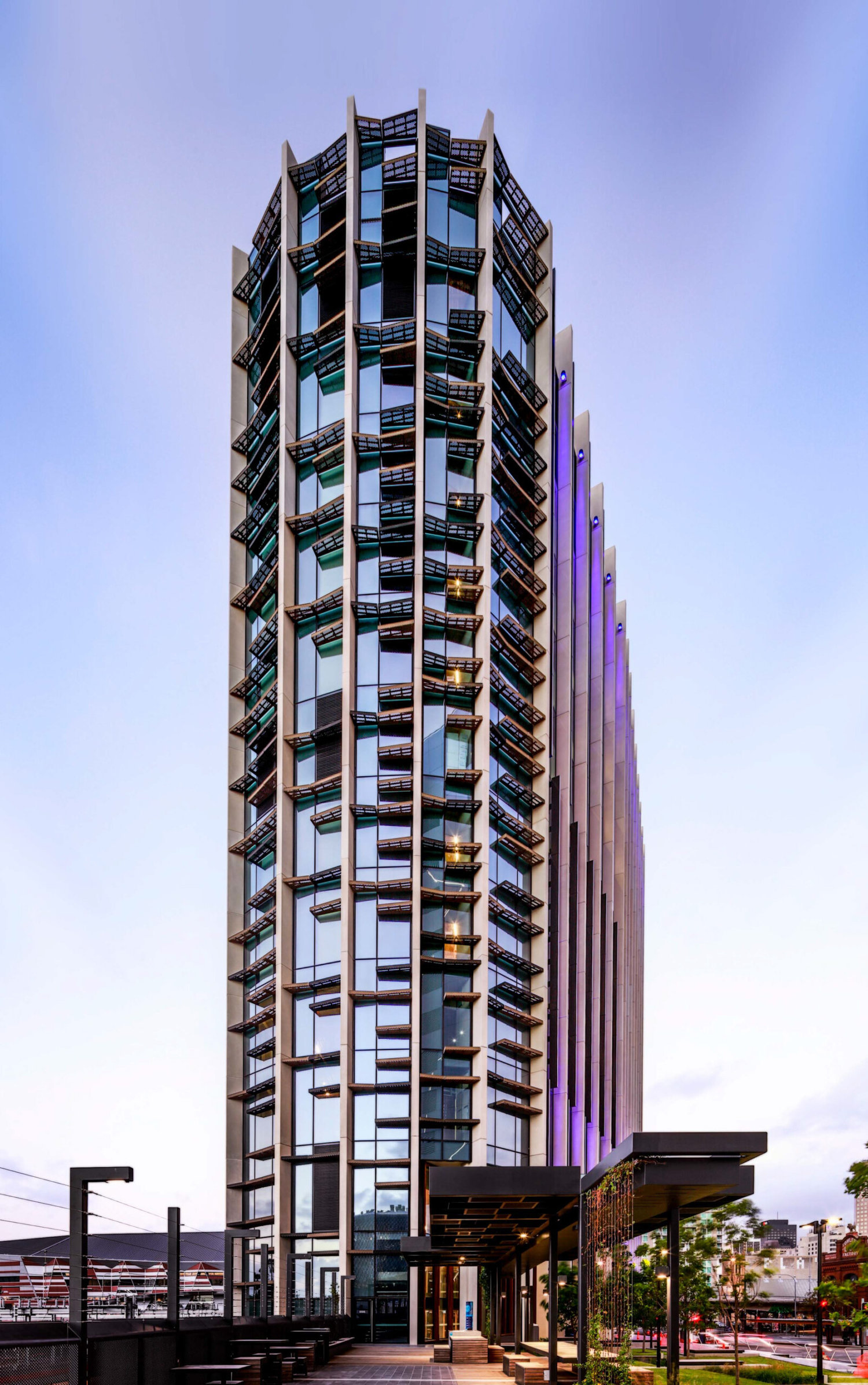 The Bradley Building is an iconic 14 level design, located in Adelaide’s Health and Biomedical Precinct, housing a technically advanced health science facility with several core functions. The Centre for Cancer Biology (CCB) comprises specialist research facilities and support spaces, office accommodation and an animal house facility. The Innovation Health Clinics provide specialist clinical spaces, consulting spaces and simulation facilities for Health Sciences. The Science | Creativity | Education Studio (SciCEd) gallery is a major science public outreach initiative involving galleries, studios, retail outlet and café. Additional space is provided for allied commercial tenants, and a significant landscaped Urban Park connects the University of Adelaide’s Integrated Clinical School Building.