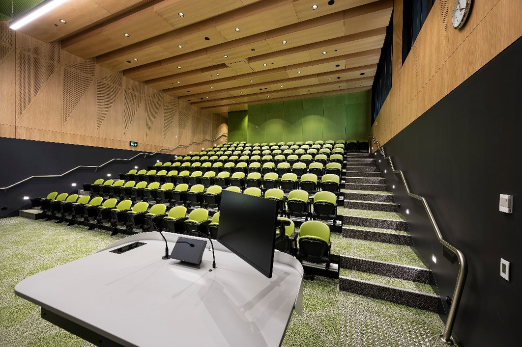 The infill accommodates operating theatres, consulting rooms, pharmacies, PC2 laboratories, audiometric booths, library facilities and the auditorium — consolidating key clinical and support functions within a cohesive and integrated footprint.